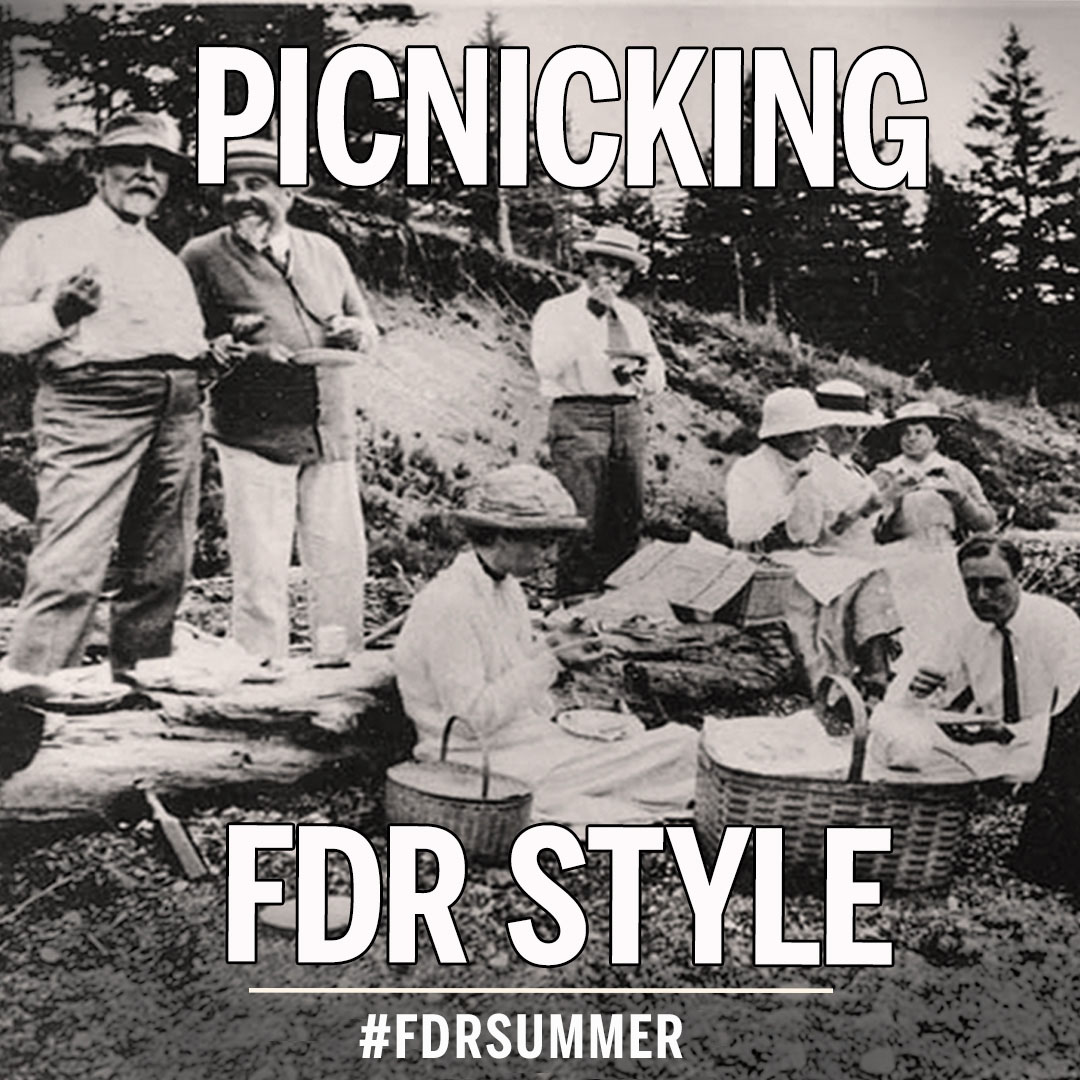 One of the Roosevelt family’s favorite outdoor activities was going on picnics. All throughout the nice weather months President and Mrs. Roosevelt would take every opportunity they got to picnic with friends and family. Sometimes they set up their basket right out on their own lawn, other times they would seek out special places in the woods near a pond or a stream.