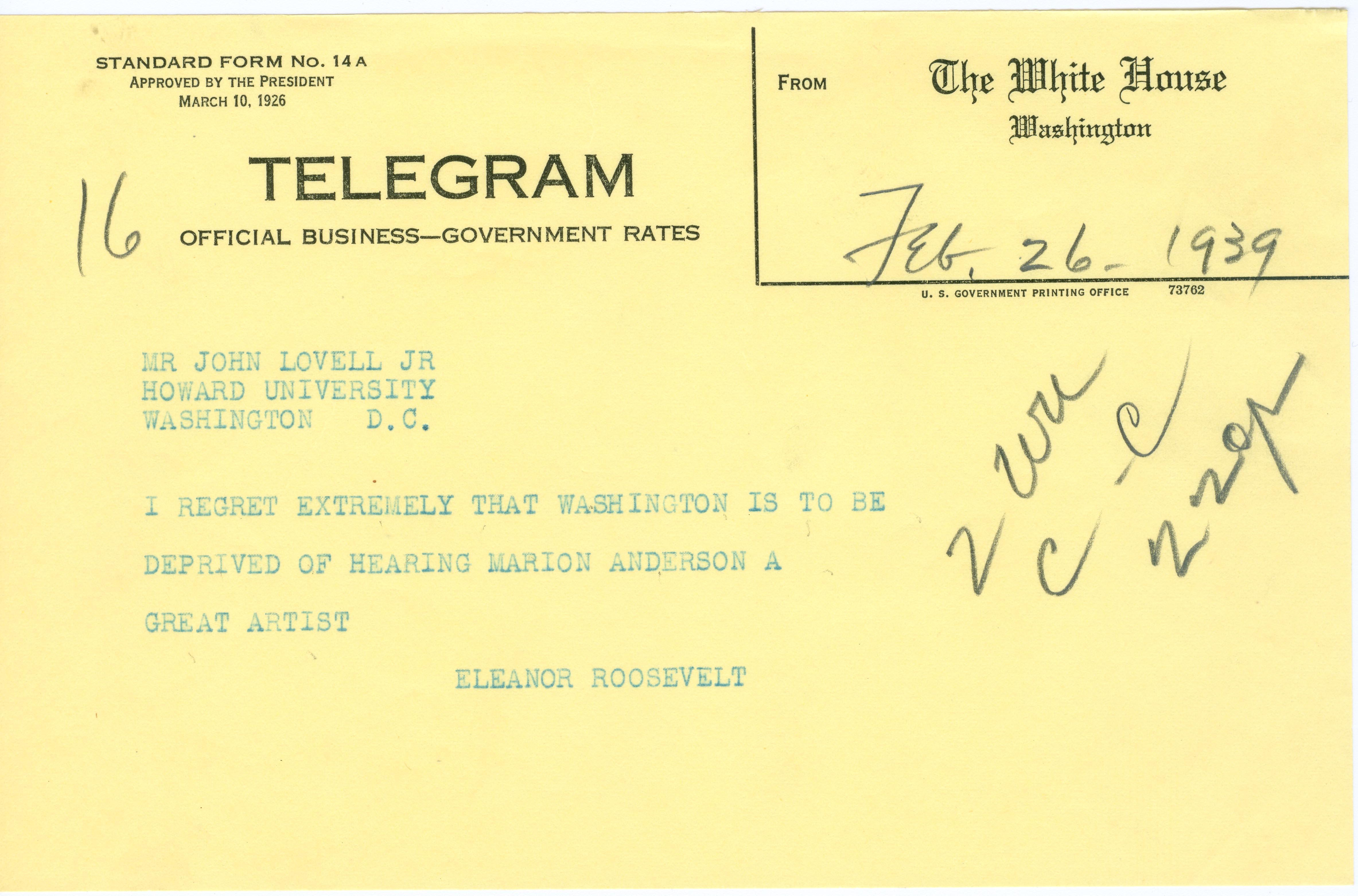 On February 26, 1939, Mrs. Roosevelt submitted her letter of resignation to the DAR president, declaring that the organization had “set an example which seems to me unfortunate” and that the DAR had “an opportunity to lead in an enlightened way” but had “failed” to do so. That same day, she sent a telegram to an officer of the Marian Anderson Citizens Committee publicly expressing for the first time her disappointment that Anderson was being denied a concert venue.