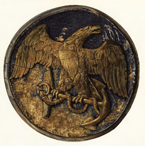 Figurehead from an unidentified ship, Watercolor, Victor Muollo Late 1930s, Federal Art Project of New York City, Works Progress Administration (WPA), MO 1956.231. One of a series of watercolors of early ship carvings produced by the Federal Art Project of Massachusetts for the Index of American Design. This carving served as an ornament for a porthole cover.