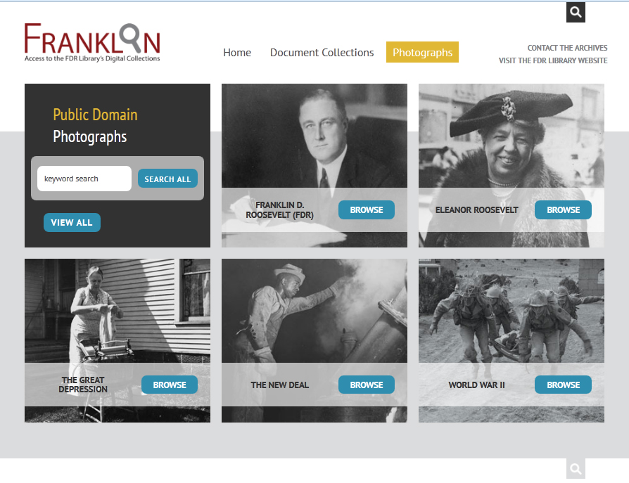 The FDR Library posts thousands of online images from its large collection of still photographs, both to the FRANKLIN database and to the Flickr photosharing website.