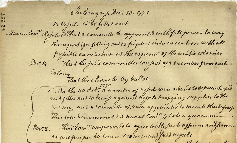 As war with the British Empire loomed in the 1770s, the Continental Congress (28 items) authorized a number of captains to become privateers (basically sanctioned pirates) to harass the British merchant ships, and then commissioned several captains to protect vital American ports. This small hodgepodge fleet known as the Continental Navy had little success against His Majesty’s mighty Royal Navy but it laid the foundation for what would soon become the U.S. Navy.